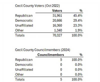 This is demonstrated by an analysis completed for Cecil County (at left). Even though only 45.4% of Cecil County voters are Republican, 100% of Cecil County Council is Republican.